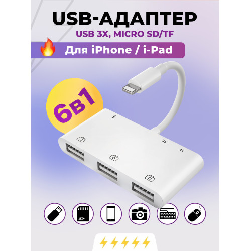 Адаптер 3 x USB и SD/TF Card Reader для iPhone/iPad с разъемом зарядки позволяет быстро перенести отснятый материал с цифровой камеры сразу двумя способами: