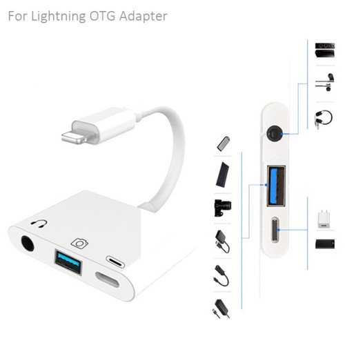 Адаптер-переходник Apple Lightning to USB OTG + Lightning for Charge + 3.5mm AUX входом - многофункциональный сплиттер для одновременно подключения наушников со стандартным 3.5 мм разъемом и зарядки устройства при помощи lightning кабеля. Значительно расширить возможности Вашего iPhone или iPad позволяет USB OTG Female разъем (называемый в народе "мама") для подключения сторонних устройств через USB кабель. С переходником Apple Lightning to USB OTG с аудио входом 3.5 мм и дополнительным разъем Lightning Вы сможете не только одновременно слушать музыку и заряжать Айфон или Айпэд, но и перенести фото и видео с цифровой камеры, подключить клавиатуру и многое другое, продолжая при этом заряжать свой мобильный гаджет.