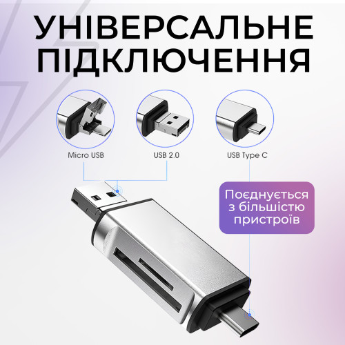 Простой и надежный, переходник USB + Type-C + MicroUSB с карт-ридером для SD и MicroSD карт не требует настроек или установки сторонних приложений. При работе с мобильными гаджетами воспользуйтесь стандартным файловым менеджером. При подключении к компьютеру или ноутбуку все еще проще. Установка драйверов происходит автоматически для всех версий Windows, MacOS, Android за минуту-две и карт-ридер
