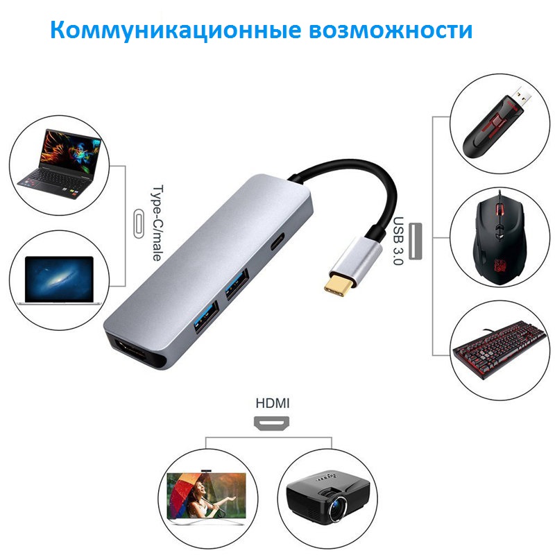 Универсальный переходник для Apple MacBook USB Type-C на USB-хаб HDMI с портом зарядки. Многофункциональное устройство способное значительно расширить возможности вашего ноутбука с интерфейсом USB-C. Два USB 3.0 порта для подключения периферийных устройств и передачи больших объемов данных на скорости 5 Гбит/с (скорость зависит от вида носителя данных), HDMI Female порт для вывода изображения с ноутбука на HDTV, монитор или проектор (для сопряжения устройств нужен HDMI кабель, не идет в комплекте). Наличие разъема USB C для подключения зарядки ноутбука освобождают Вас от необходимости ограничивать себя по времени и прерывать работу для подзарядки.