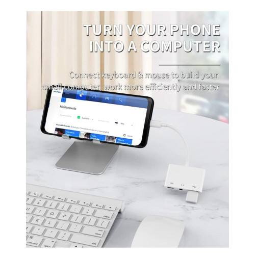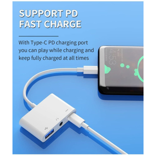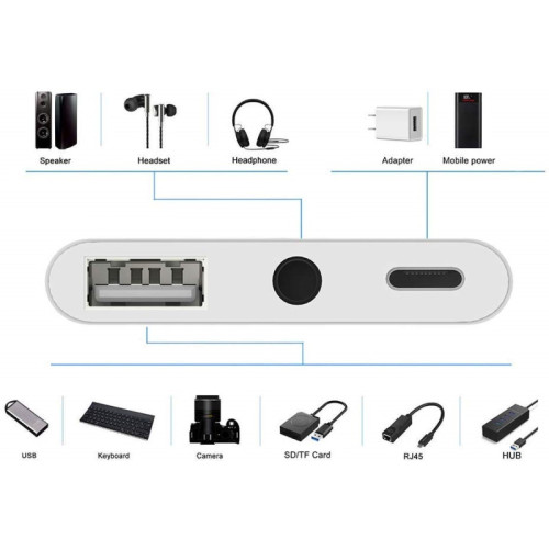 Адаптер-переходник USB-C to USB OTG + Type-C for Charging + Audio 3.5mm - многофункциональный сплиттер для одновременно подключения наушников со стандартным 3.5 мм разъемом и зарядки устройства при помощи USB Type-C кабеля. Значительно расширить возможности Вашего смартфона, планшета, имеет USB OTG Female разъем (называемый в народе "мама") для подключения сторонних устройств через USB кабель. С переходником USB-C to USB OTG с аудио входом 3.5 мм и дополнительным разъем USB-C Вы сможете не только одновременно слушать музыку и заряжать смартфон или планшет, но и перенести фото и видео с цифровой камеры, подключить клавиатуру и многое другое, продолжая при этом заряжать свой мобильный гаджет.