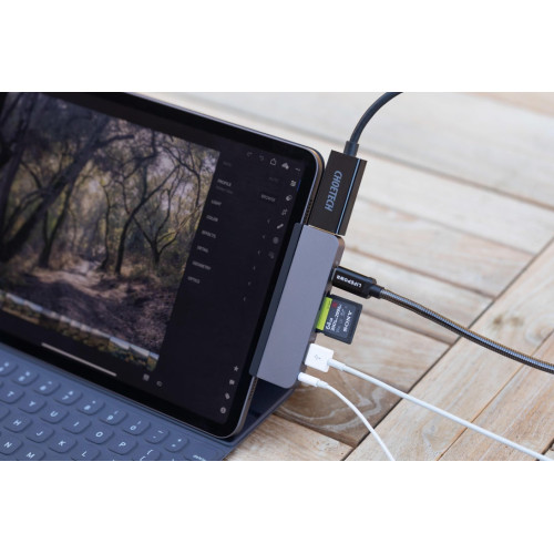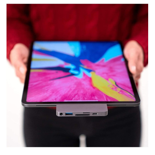 Дизайн : Хаб выглядит как естественное продолжение iPad Air 4/Pro 2020/2018 года. Он соответствует основному дизайну планшетов: имеет оптимальную толщину, прямоугольные края, закругленные углы, а также серый и серебристый цвета. Конструкция этого концентратора предусматривает подключение удлинительного кабеля USB-C.