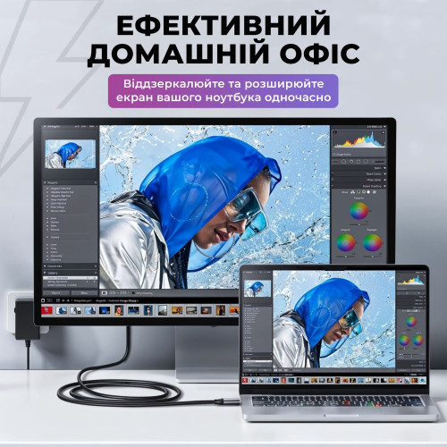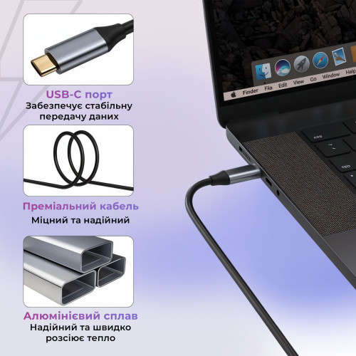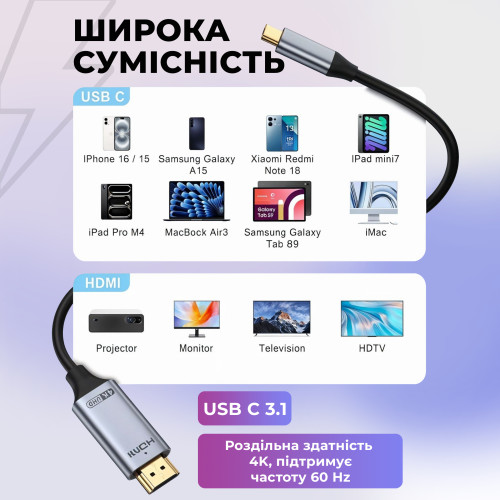 Продукт поддерживает передачу видеоконтента в формате 4K и 2K с частотой до 30Гц. В качестве устройства вывода может служить любое устройство с разъемом HDMI Female. Для начала работы установка драйверов не требуется, специальное операционного обеспечение также не нужно. Видео отображается в "зеркальном" режиме : все что отображается на экране ноутбука автоматически через кабель Type-C - HDMI передаются на большой монитор или проектор. Длина кабеля 1.8 м позволяет комфортно соединить Macbook или другой ноутбук с разъемом USB-C с большим экраном.