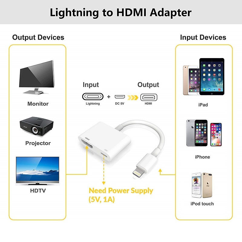 Переходник Lightning to HDMI обеспечивает поддержку следующих устройств: iPhone 11, iPhone 11 Pro,iPhone 11 Pro Max, iPhone XS,iPhone XS Max, iPhone X, iPhone 8/8 Plus, iPhone 7/7 Plus, iPhone 6 / 6S, iPhone 6 Plus / 6S Plus, iPhone 5 / 5S / 5C / SE; iPad Air, iPad Pro, iPad Mini, ipod Touch 5th / ipod Touch 6th. Поддерживает разрешение до 1920 на 1080 с сохранением качества передачи звука.
