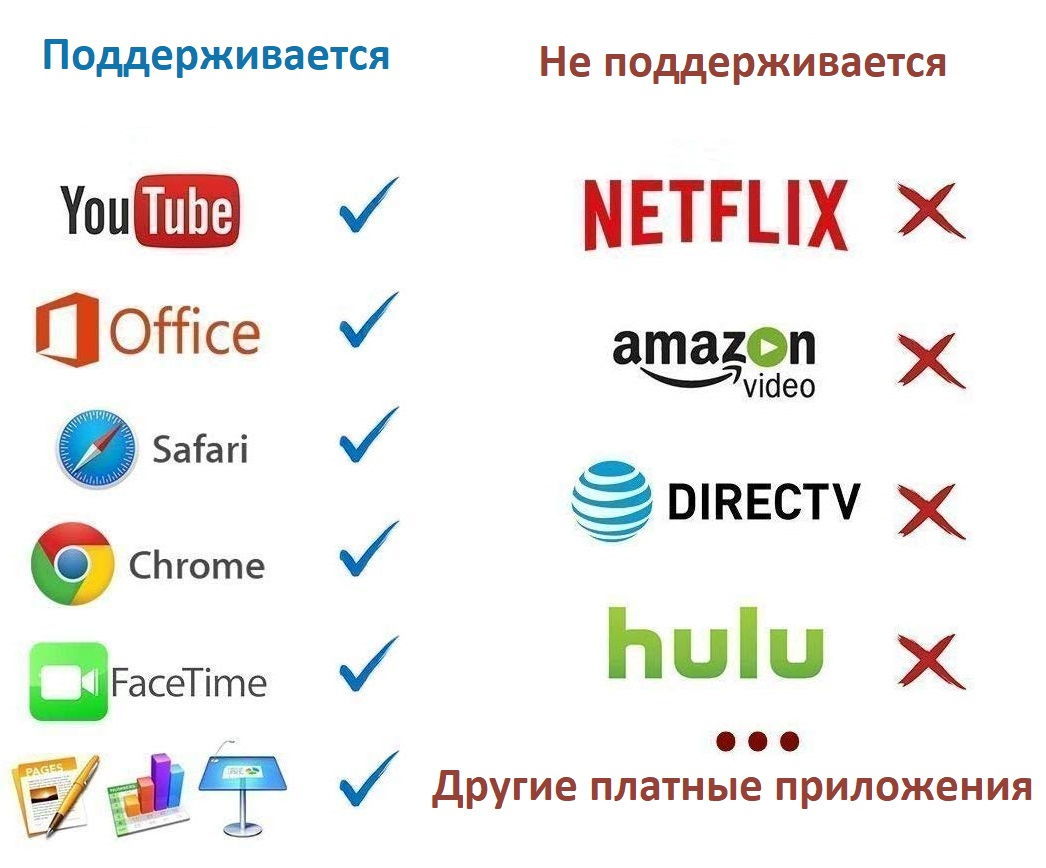 Адаптер-переходник Lightning to HDMI Apple Digital AV Adapter 1080P поддерживает видео: YouTube, Hulu Plus, IDMB, Quickly, Family On TV, ABC, NBC, FOX, Microsoft Office. Обратите внимание: не поддерживает Netflix / HBO GO / Affinity Player / Prime / Hulu / DIRECTV и другие видео в платных приложениях.