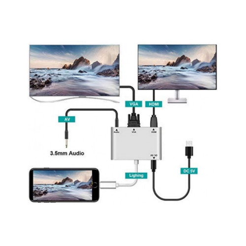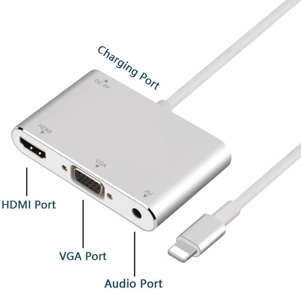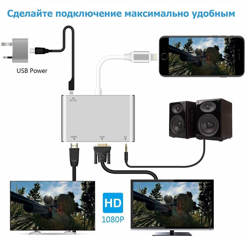 Адаптер Lightning to HDMI/VGA/Audio для iPhone: цифровой AV-адаптер с Lightning на HDMI, VGA и AV / 3.5 мм, обеспечивает быстрое и стабильное подключение к телевизору, HDTV, проектору, дисплею с интерфейсом HDMI, VGA и AV. Поддержка зеркального отображения того, что отображается на экране вашего iPhone или iPad, включая приложения, презентации, веб-сайты и многое другое. В качестве устройства отображения контента может служить: телевизор с поддержкой HDMI, дисплей, проектор или другой совместимый дисплей с разрешением до 1080P HD.