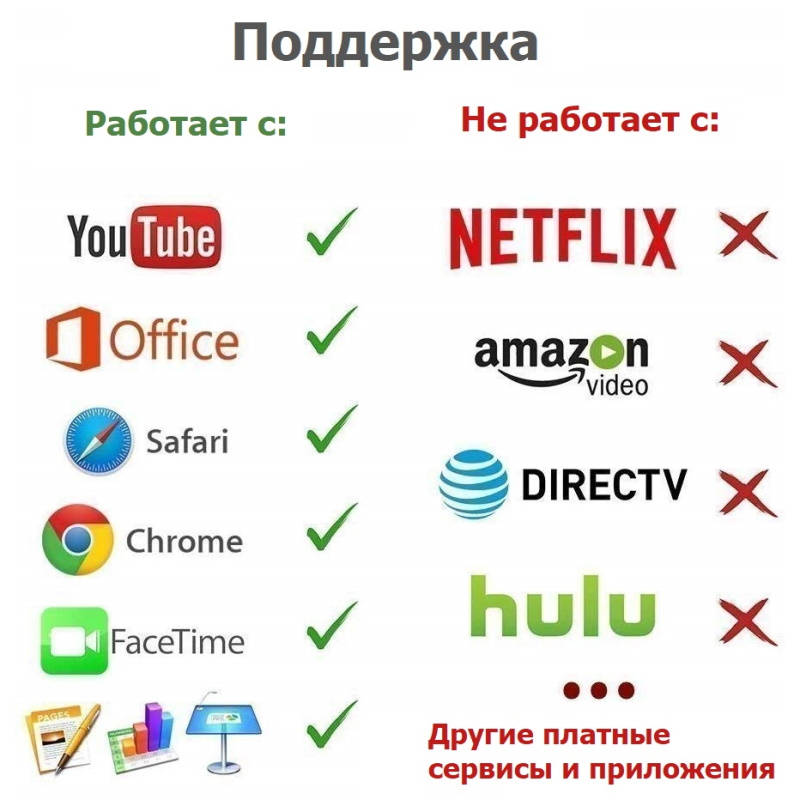 Поддерживает YouTube, Hulu Plus, IDMB, Quickflix, Family On TV, ABC, NBC, FOX, Microsoft Office и другие видео, загруженные и сохраненные на ваших устройствах IOS для потоковой передачи. Обеспечивает подключение широкому перечню старых и новых телевизоров, мониторов, проекторов, ноутбуков благодаря наличию HDMI и VGA портов.