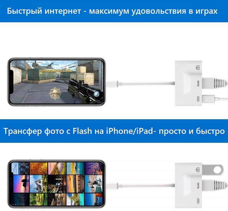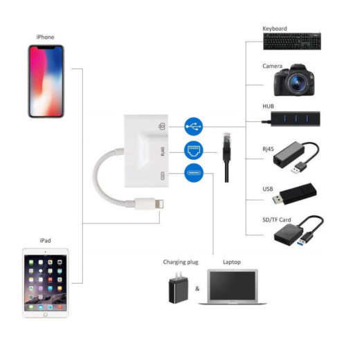 Переходник Lightning to RJ45-Lightning RJ45 USB 3.0A адаптер с возможностью параллельной зарядки. Позволяет передавать фотографий с цифровой камеры на iPhone / iPad, подключать периферийные USB-устройства, таких как хабы, аудио / MIDI-интерфейсы, кард-ридеры и многое другое, делая вашу жизнь более удобной.