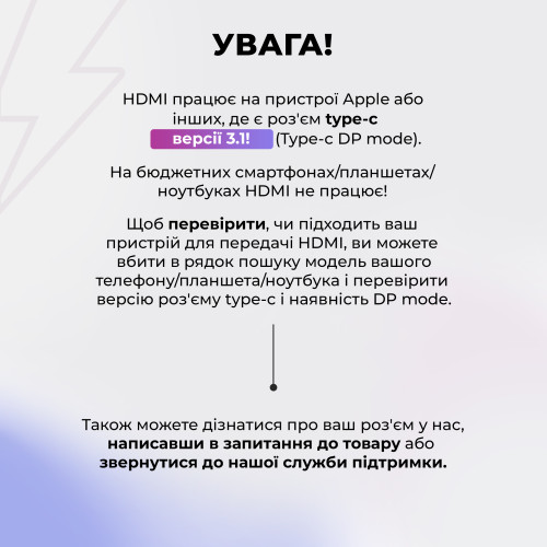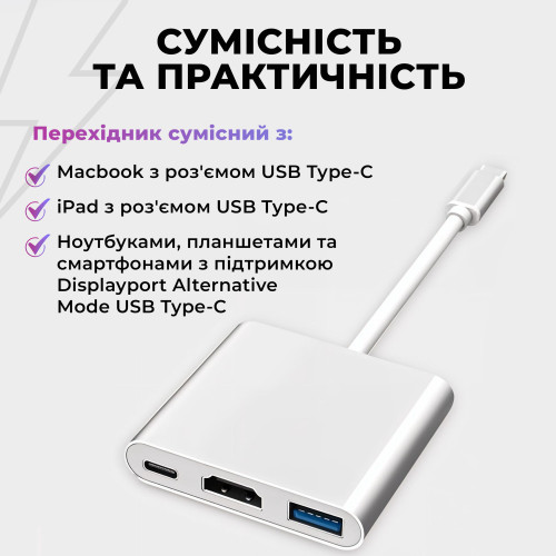Порт-адаптер 4K HD USB Type-C. Делайте презентации, работайте, смотрите видео и фото с семьей на большом экране. Переходник с USB-C на HDMI с портом зарядки и дополнительным USB разъемом поможет превратить Ваш Макбук в мощный рабочий инструмент. Сочетайте компактность ноутбука и потрясающие возможности большого экрана при помощи удобного переходника для Appe Macbook и других ноутбуков с Type C портом. Передача видео может быть в двух режимах: