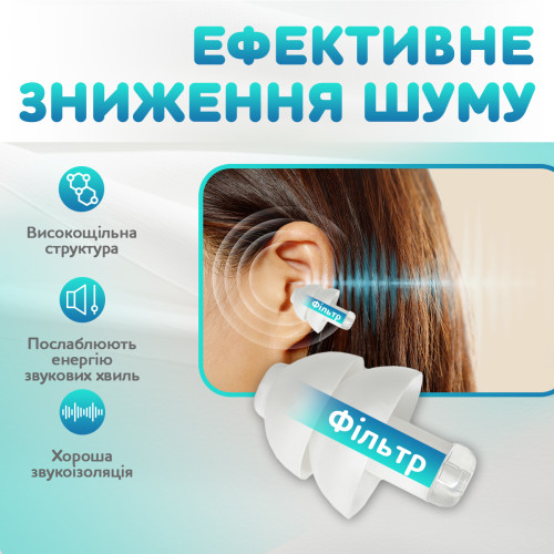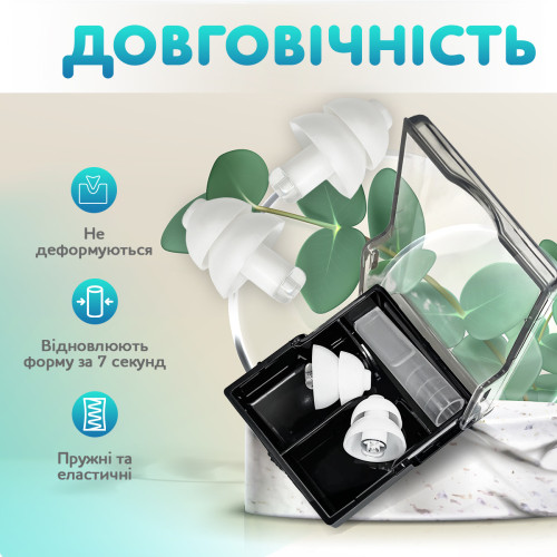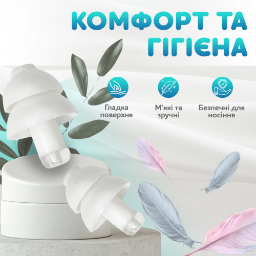 Беруши из очень мягкого и комфортного материала - термопластика (разновидность силикона) станут незаменимой вещью для комфортного и спокойного сна. Фильтры берушей не имеет сквозных отверстий, в отличие от других специализированных берушей для сна. Шумоподавление данных берушей около 24 дБ. Стоит отметить, что фильтр берушей из пластика, хотя он размещается внутри вкладышей, у людей с чувствительным ушным каналом может возникнуть дискомфорт. В этом случае таким людям лучше выбирать беруши с мягким фильтром или без него. Беруши являются универсальными и подходят для сна, путешествий, для работы и др. назначений, но благодаря очень мягкому и комфортному материалу они идеальны для сна.