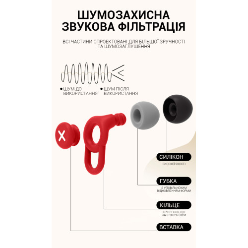 Комплектація Берушів для сна складаються із основи (навушники) та змінних насадок: силікон (м), губка (м), губка (х1) 3 шт.. Призначені для захисту органів слуху.