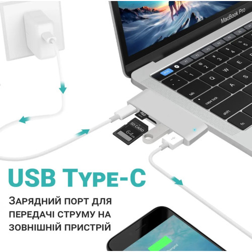 USB хаб перехідник для ноутбука USB Type C to PD SD/TF card reader 2xUSB 3.0 7в1 Pavlysh UH71 - є універсальним адаптером для підключення декількох пристроїв через один порт USB Type-C. У сучасних ноутбуках, ультрабуках і навіть комп'ютерах часто не вистачає різноманітних портів, а п'яти портовий хаб ідеально підходить для вирішення цієї проблеми.