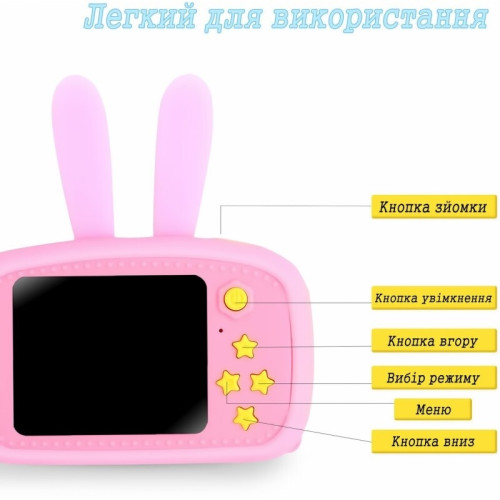 Детский цифровой фотоаппарат зайчик - это отличная цифровая игрушка, позволяющая ребенку развивать свои творческие навыки, креативность, способность изучать окружающий мир. Гаджет имеет оригинальный и привлекательный внешний вид, так же отлично подойдет и на подарок. А ударопрочный корпус в комплекте с чехлом сделают игрушку безопасной и долговечной. Функционал расширен визуальными эффектами для фото, видео, а также 3 встроенными играми, которыми можно развлечься, если фото утомили. Хороший способ отвлечь ребенка от телефона.