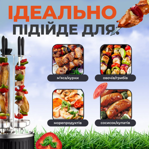 С её помощью можно приготовить свиной, куриный, овощной шашлыки, люля-кебаб или шашлык из морепродуктов, пожарить креветки с мидиями, а может просто пожарить сосиски на жаровне или на шампурах. Также на шампуры можно нанизать все, что угодно, включая овощной микс и кусочки сала. Больше не нужно возиться с дровами, углем, жидкостью для розжига и пачкать одежду.