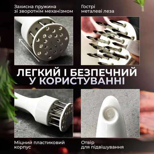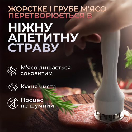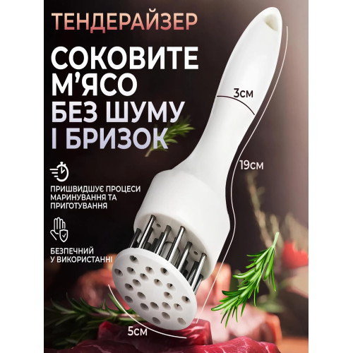 Размягчитель мяса – тендерайзер игольчатого типа. Разрыхленное с помощью тендерайзера мясо лучше сохраняет вкусовые качества, оставаясь при жарке мягким и сочным. При обработке тендерайзером волокна продукта травмируются меньше, чем при обработке тяпкой или молотком, а соединительные ткани, наоборот, максимально разрушаются. Кроме того, тепловые волны легче проходят сквозь ткани разрыхленного продукта, и мясо прожаривается намного быстрее и равномернее.
