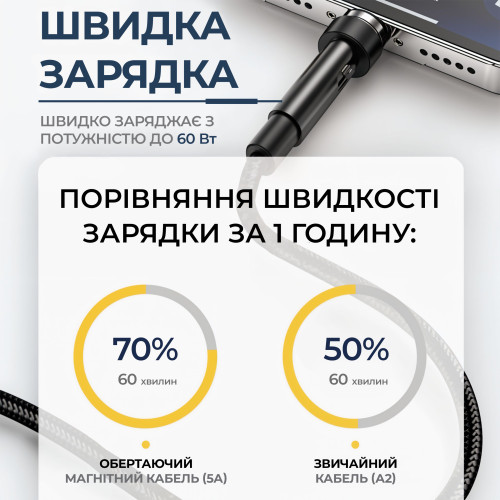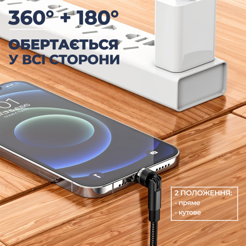 Вращение на 360° и 180° - Конструкция магнитной головки с вращением на 360° и 180° облегчает зарядку. Магнитная зарядная головка может вращаться не только на 360 градусов, но и на 180 градусов. От прямой зарядки до Г-образной зарядки под углом 90° — удобнее заряжать в любом месте. В целом, магнитный кабель с поворотом на 540 градусов - это удобное и функциональное решение для зарядки и передачи данных, обеспечивающее удобство использования и долговечность ваших устройств.