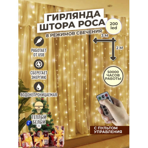 Гирлянда штора роса светодиодная 3x2м занавеса водопад LED 200 теплый белый цвет Gold