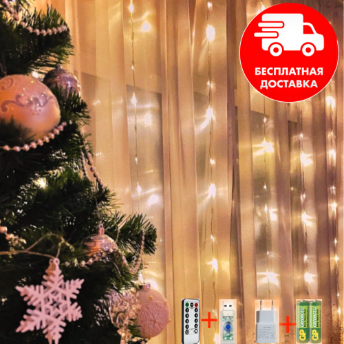 Светодиодная гирлянда штора занавес длинной 3 и шириной 2 метра, имеет 10 спускающихся лучей и каждый содержит 20 светодиодов яркого свечения с низким электропотреблением. В комплекте пульт дистанционного управления. Есть возможность настроить свечение от яркого динамического до нежного с переливом теплого белого и подобрать режим переключений гирлянды.