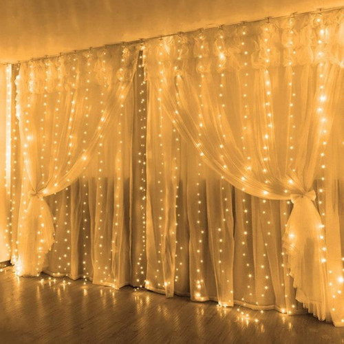 Светодиодная гирлянда штора занавес длинной 3 и шириной 3 метра, имеет 10 спускающихся лучей и каждый содержит 30 светодиодов яркого свечения с низким электропотреблением. Есть возможность настроить свечение от яркого динамического до нежного с переливом теплого белого и подобрать режим переключений гирлянды.