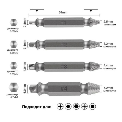 | Комплектация | 4 бита различного диаметра для разного типа шурупов: №1 - винты №4-7; болты 5 мм №2 - винты №8-10; болты 6 мм №3 - винты №11-14; болты 8 мм №4 - винты №16-24; болты 10 мм |
