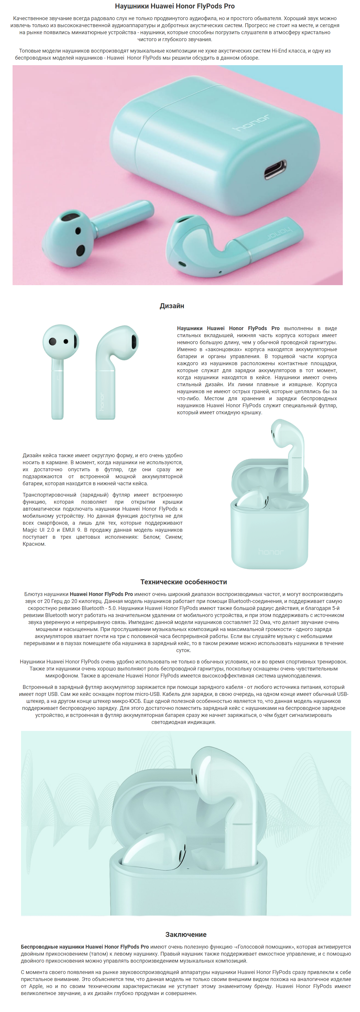 Ассиметричный кабель; Влагонепроницаемые; Шумоподавление микрофона; Вынимая один наушник из уха, вы автоматически ставите трек на паузу; Серия Honor FlyPods оснащена двумя микрофонами