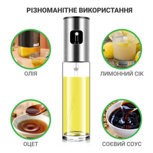 Данный девайс помогает дозировать количество масла для приготовления пищи. Ваша пища всегда будет в меру жирной, а нанесение равномерным слоем на поверхность сковороды и противня исключит пригорание любимых продуктов. Такой распылитель идеально подходит для заправки порционных салатов и блюд, во время жарки блинов, выпекания в духовом шкафу. Емкость выполнена из стекла, имеет стильный и эргономичный дизайн.
