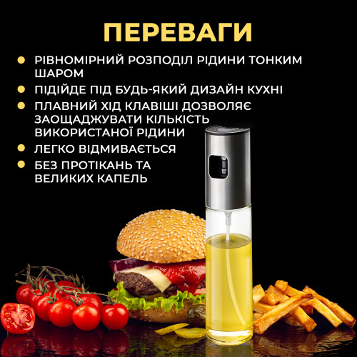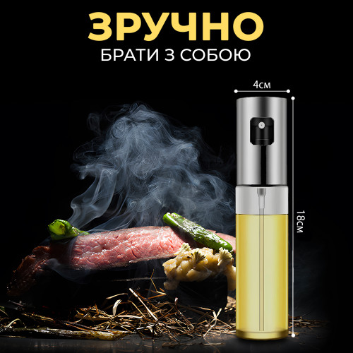 Распылитель для масла соусов уксуса. Это именно то, что позволит Вам вести здоровый образ жизни! С данным распылителем вы наконец-то сможете равномерно, использую минимальное кол-во жира готовить салаты, готовить рыбу, мясное и овощи. Незаменимая вещь для приготовления блинов и оладьев, подготовка противней к выпечке, и прочее. Распылитель имеет специальную помпу, благодаря которой, растительные жиры распыляются а не капают одной каплей. Подходит так же для уксуса, соевого соуса, лимонного сока и прочих заправок. Данный девайс помогает дозировать количество масла для приготовления пищи. Ваша пища всегда будет в меру жирной, а нанесение равномерным слоем на поверхность сковороды и противня исключит пригорание любимых продуктов. Такой распылитель идеально подходит для заправки порционных салатов и блюд, во время жарки блинов, выпекания в духовом шкафу. Емкость выполнена из стекла, имеет стильный и эргономичный дизайн. Широко используется для приготовления салатов, барбекю, выпечки, жарки.