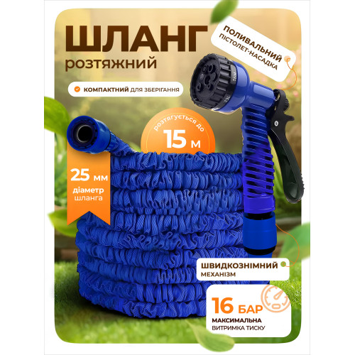 Шланг для полива садовый Magic Hose 15 метров растягивающийся с насадкой распылителем Синий PAVLYSH (PA-700073)