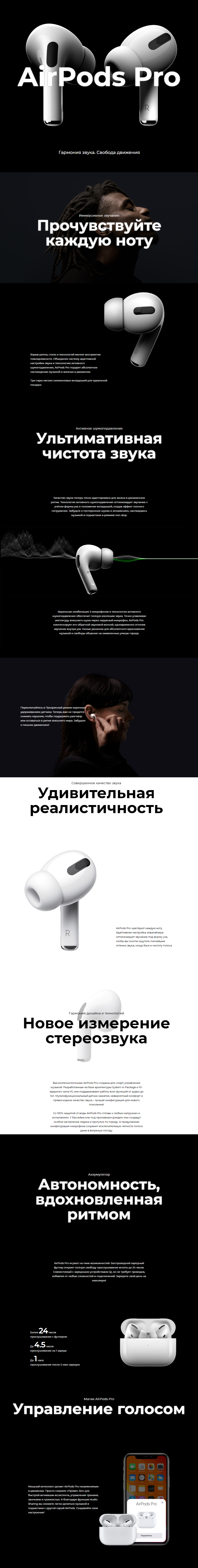 Дополнительные возможности Вкладыши трёх размеров для комфортной и надёжной фиксации наушников/ Открытый режим/ Потрясающее качество звука благодаря адаптивному эквалайзеру/ Защита от пота и воды (IPX4)/ Автоматическое включение и подключение к устройству/ Простая настройка для работы с любыми устройствами Apple/ Быстрая зарядка в чехле/ Чехол можно заряжать через разъём Lightning или с помощью устройств для беспроводной зарядки стандарта Qi/ Активное шумоподавление/ Открытый режим/ Адаптивный эквалайзер/ Система выравнивания давления/ Драйвер с широкой амплитудой, разработанный Apple/ Особый усилитель с широким динамическим диапазоном/ Сдвоенные направленные микрофоны/ Внутренний микрофон/ Двойные оптические сенсоры/ Акселерометр распознавания движения/ Акселерометр обнаружения голосовой активности/ Датчик нажатия