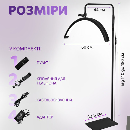 | Дополнительные характеристики | Количество светодиодов: 320 шт Три типа освещения: Холодный / Теплый / Нейтральный Пульт дистанционного управления Bluetooth Высота штатива: 90-170 см Материал: Алюминий |