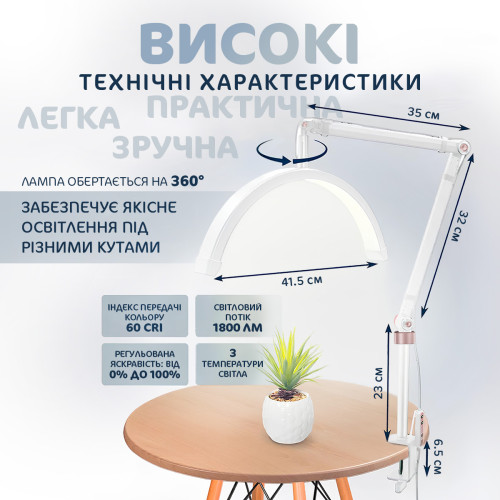 ФУНКИЦОНАЛЬНОСТЬ: плафон лэд лампы можно поворачивать на 360°, а его широкая серповидная форма устраняет тени и мертвые зоны. Яркий свет – незаменимый помощник в тонких и профессиональных работах, таких как : создание контента для товара, перманентный макияж, татуаж и наращивание ресниц.