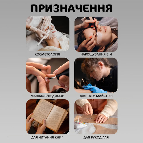 ФУНКИЦОНАЛЬНОСТЬ: плафон лэд лампы можно поворачивать на 360°, а его широкая серповидная форма устраняет тени и мертвые зоны. Яркий свет – незаменимый помощник в тонких и профессиональных работах, таких как : создание контента для товара, перманентный макияж, татуаж и наращивание ресниц.