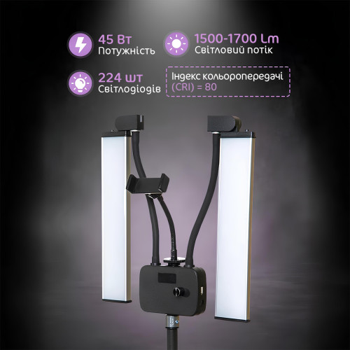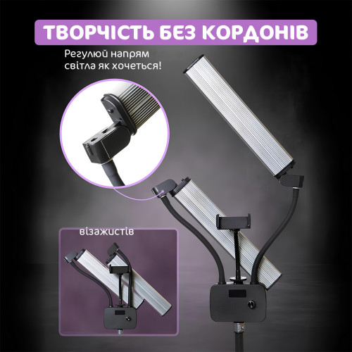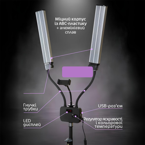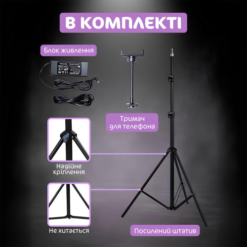 | Дополнительные характеристики | Три типа освещения: Холодный / Теплый / Нейтральный Высота штатива: 2 м Материал: Алюминий |