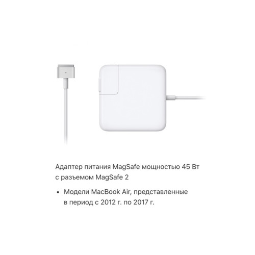 Шнур питания переменного тока снабжен адаптером для максимальной длины шнура, а также адаптер имеет достаточно компактный дизайн, чтобы беспрепятственно путешествовать в любую точку мира, не утяжеляя свой багаж. Apple Magsafe 2 разработан, чтобы быть идеальным попутчиком, адаптер имеет продуманный дизайн который позволяет кабелю DC быть смотанным опрятно вокруг для легкого хранения. Адаптер заряжает батарею пока система находится в спящем режиме. Совместимость с MacBook Air с возможностью подключения к порту питания MagSafe 2.